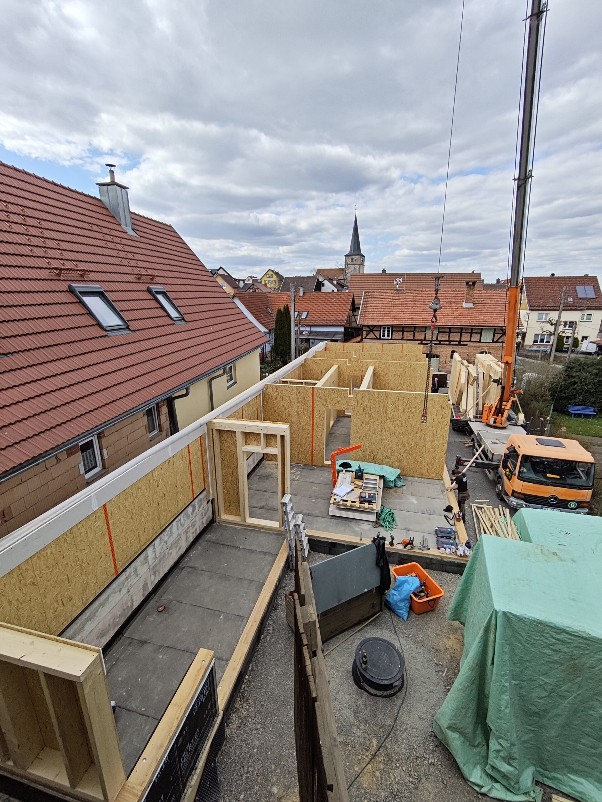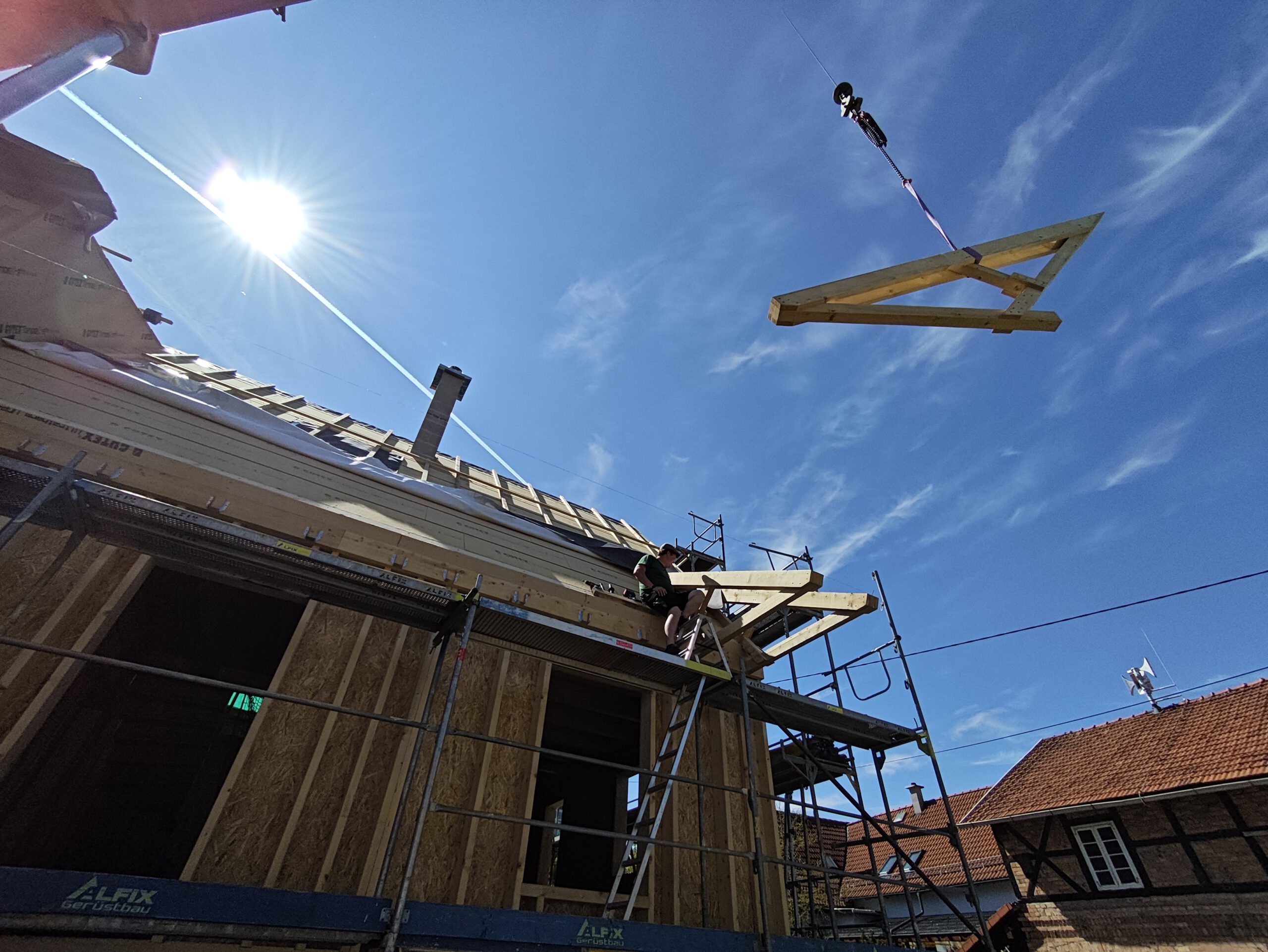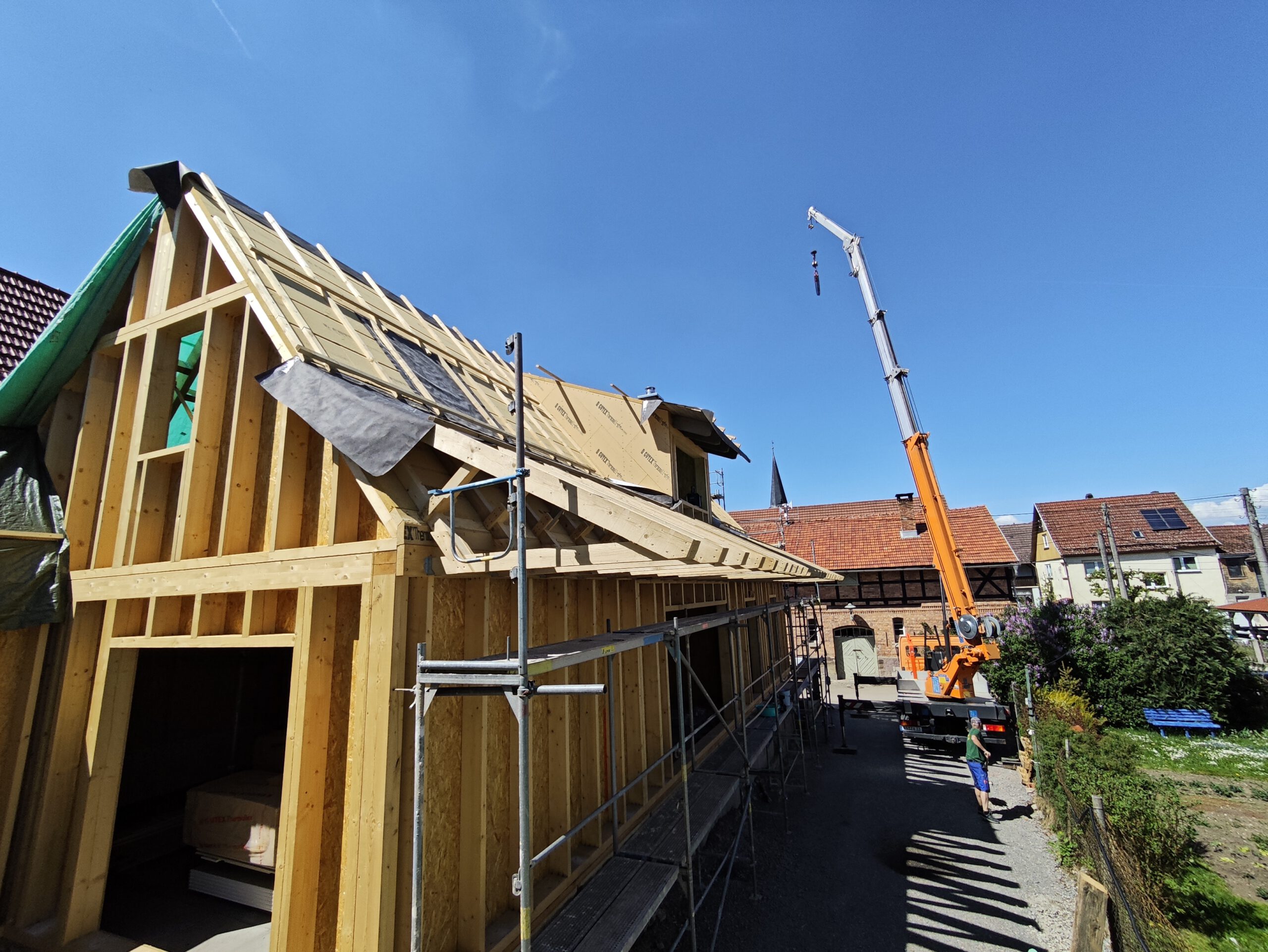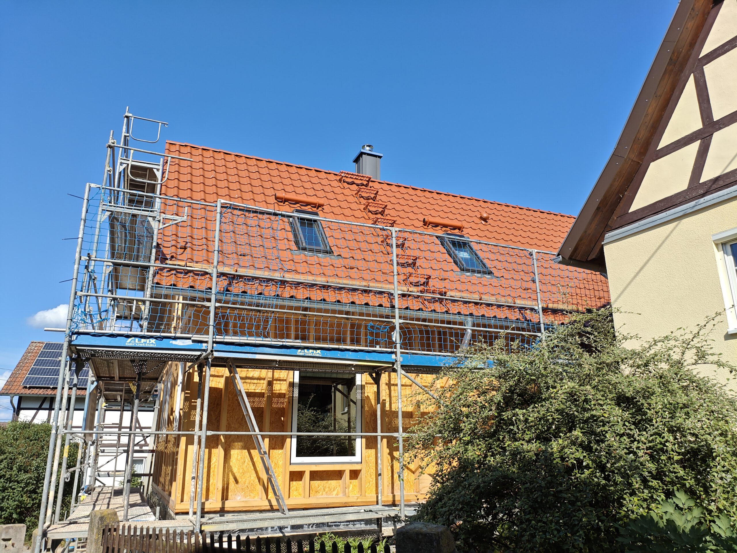 Anfang April 2025 begann die Montage des Holzhauses mit dem Setzen der Nivellierschwellen. In kurzer Bauzeit wurden die insgesamt 37 Wandelemente montiert sowie die Balken-, Pfetten- und Sparrenlagen aufgerichtet. Nach dem Richtfest folgten die Montage des freitragenden Vordachs und die vollständige Wetterfestmachung des Gebäudes. Diese umfasste die Beplankung mit diffusionsoffenen Holzweichfaserplatten, die Lattung, den Einbau der Dachfenster, sämtliche Klempnerarbeiten sowie die Ziegeleindeckung. Bereits Anfang Juni war der Rohbau des Einfamilienhauses abgeschlossen.