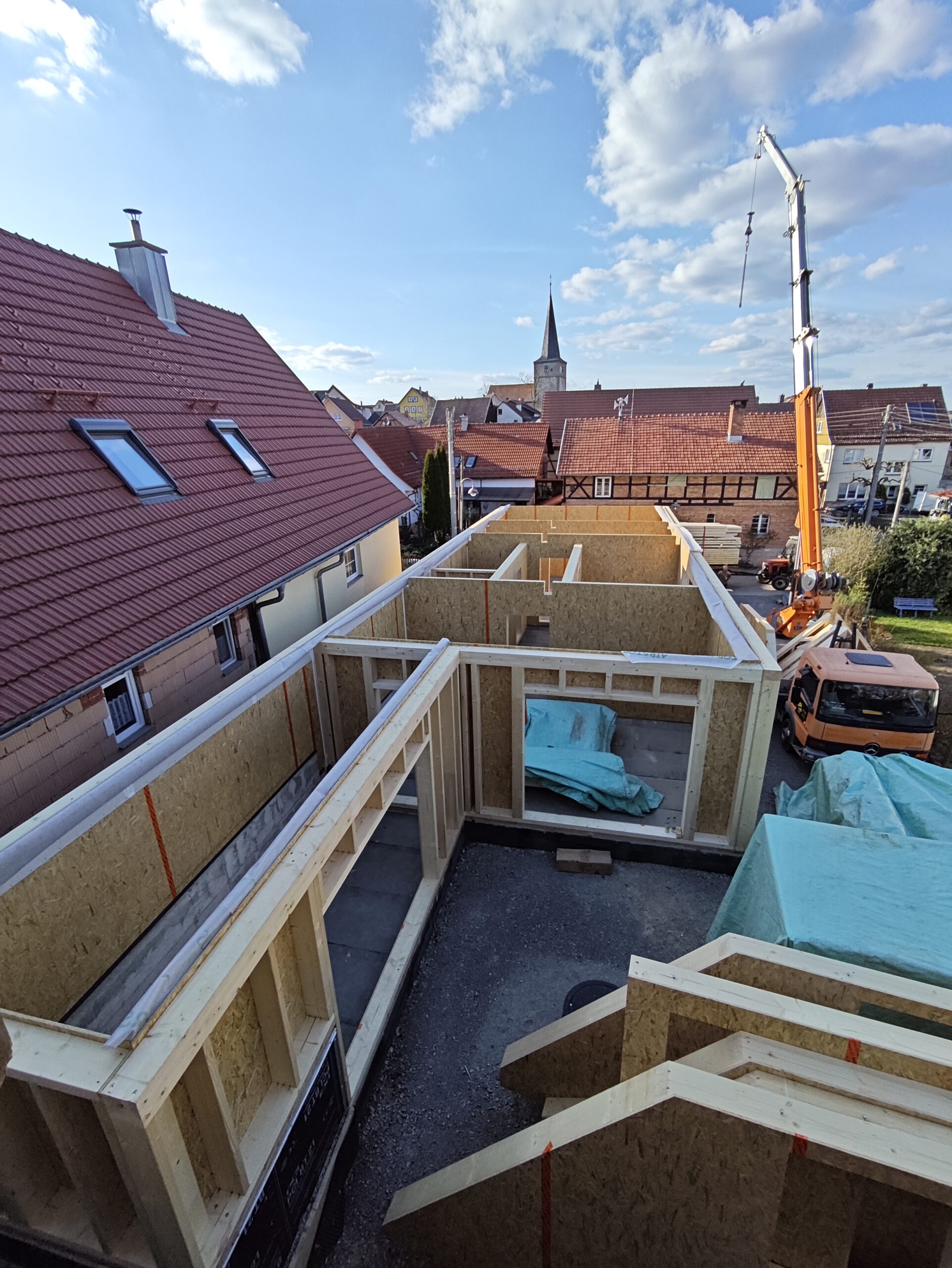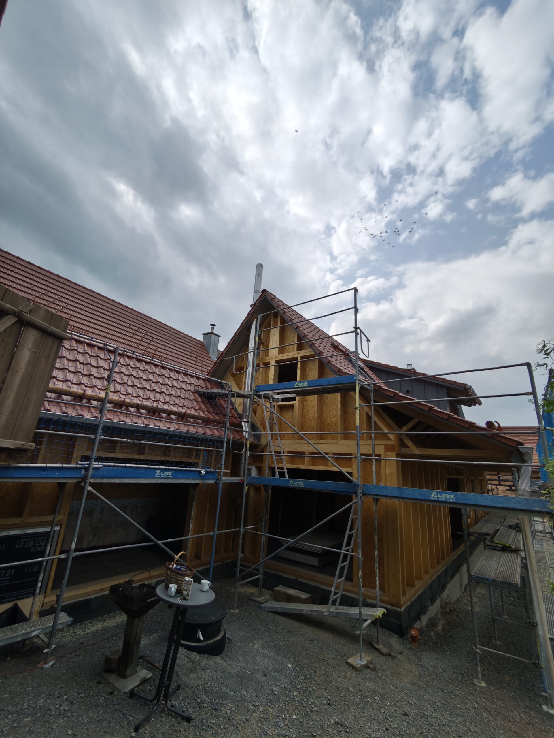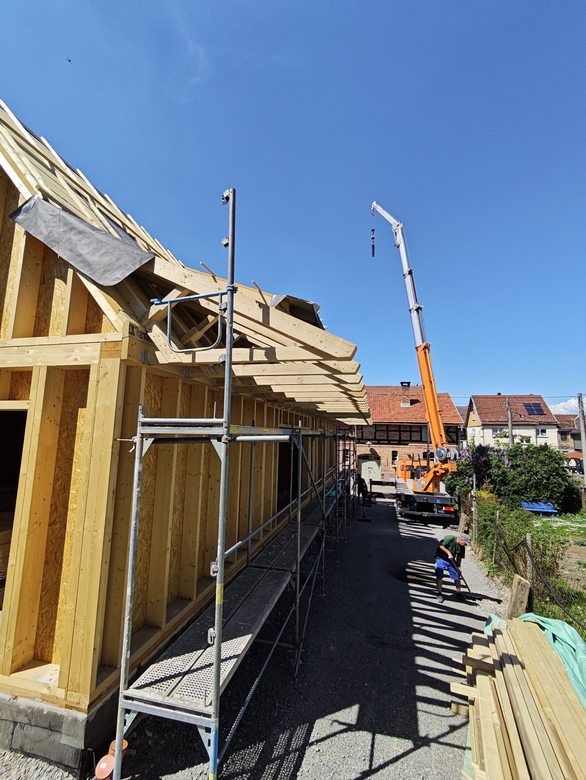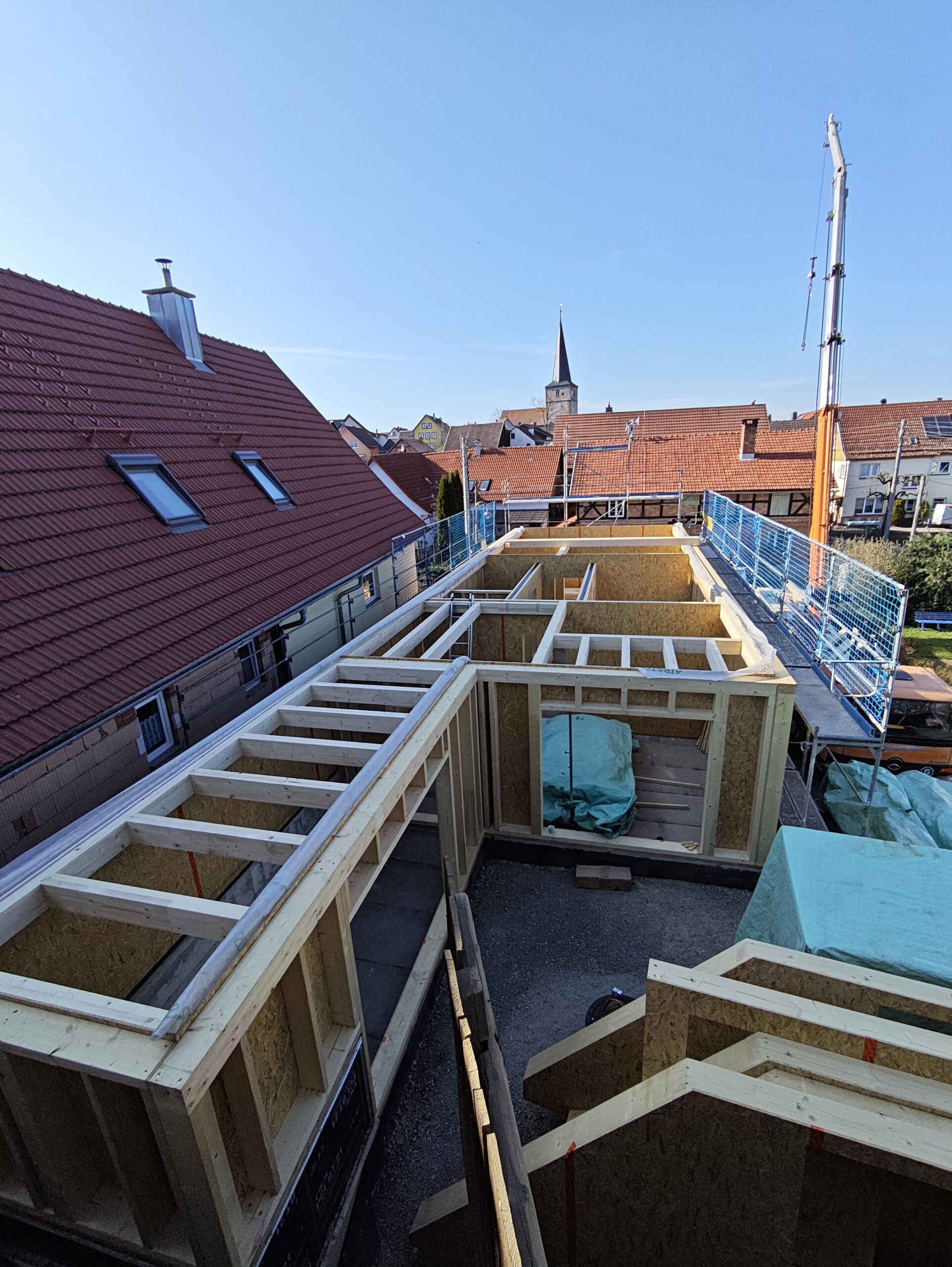 Anfang April 2025 begann die Montage des Holzhauses mit dem Setzen der Nivellierschwellen. In kurzer Bauzeit wurden die insgesamt 37 Wandelemente montiert sowie die Balken-, Pfetten- und Sparrenlagen aufgerichtet. Nach dem Richtfest folgten die Montage des freitragenden Vordachs und die vollständige Wetterfestmachung des Gebäudes. Diese umfasste die Beplankung mit diffusionsoffenen Holzweichfaserplatten, die Lattung, den Einbau der Dachfenster, sämtliche Klempnerarbeiten sowie die Ziegeleindeckung. Bereits Anfang Juni war der Rohbau des Einfamilienhauses abgeschlossen.