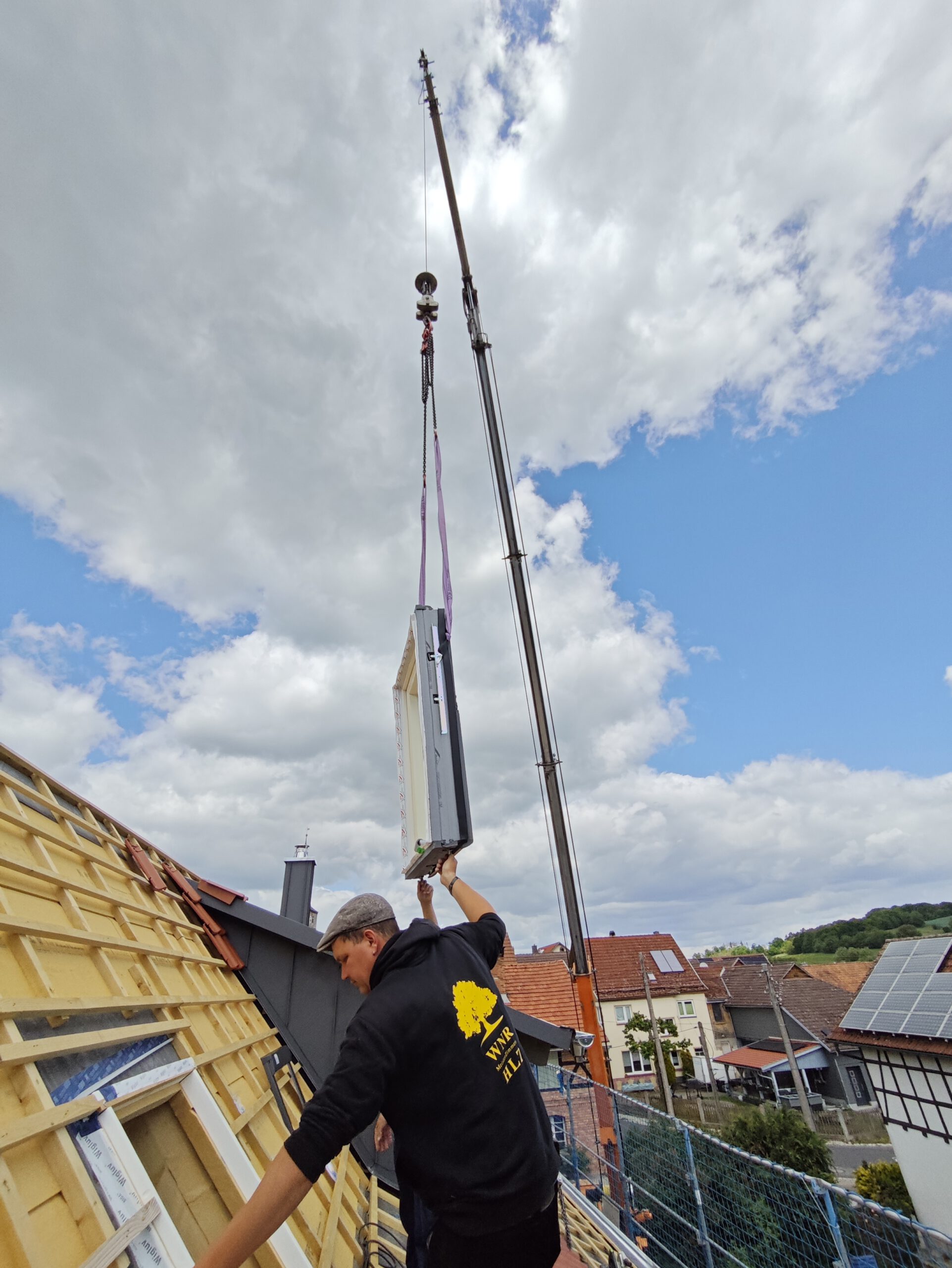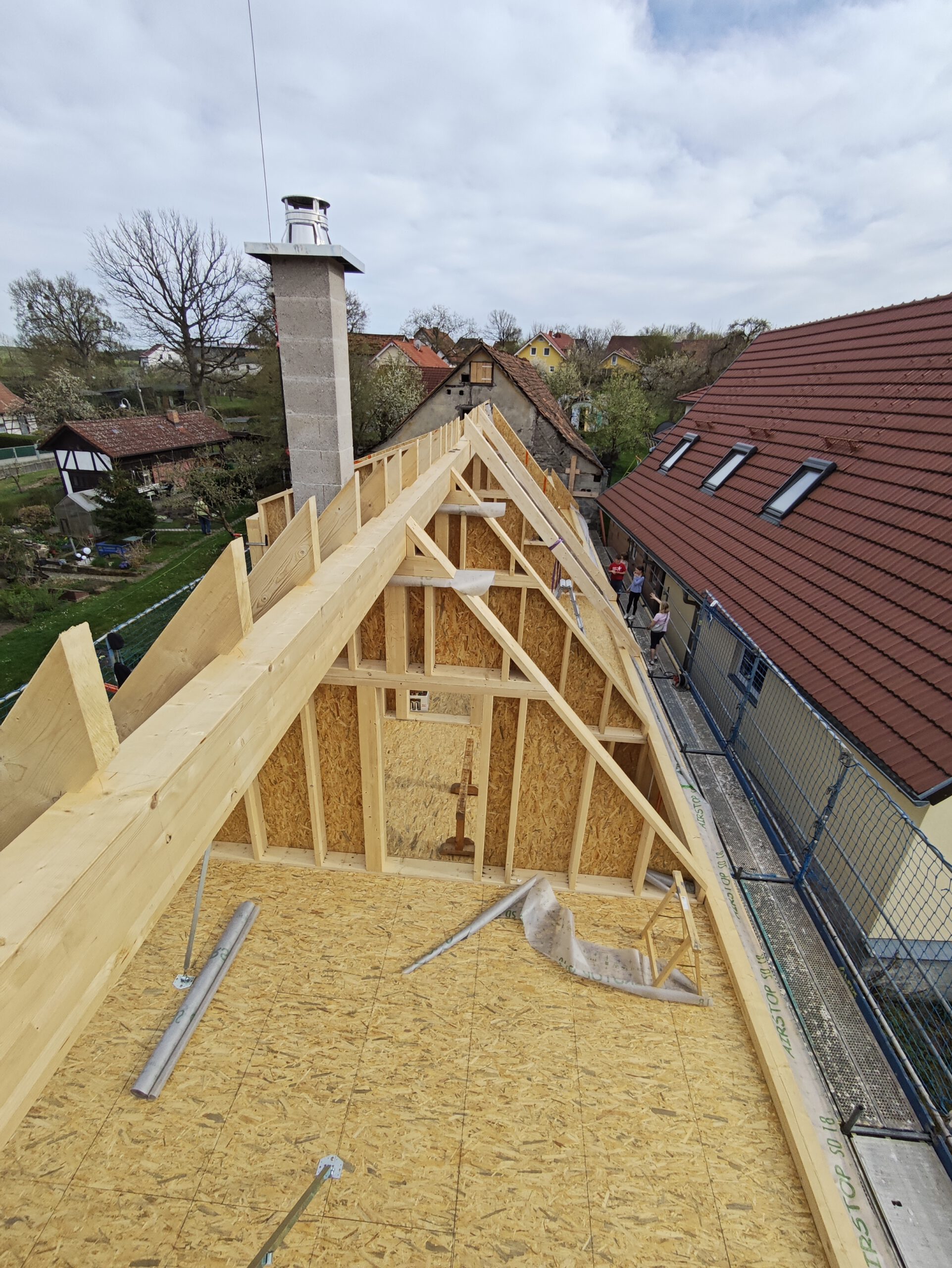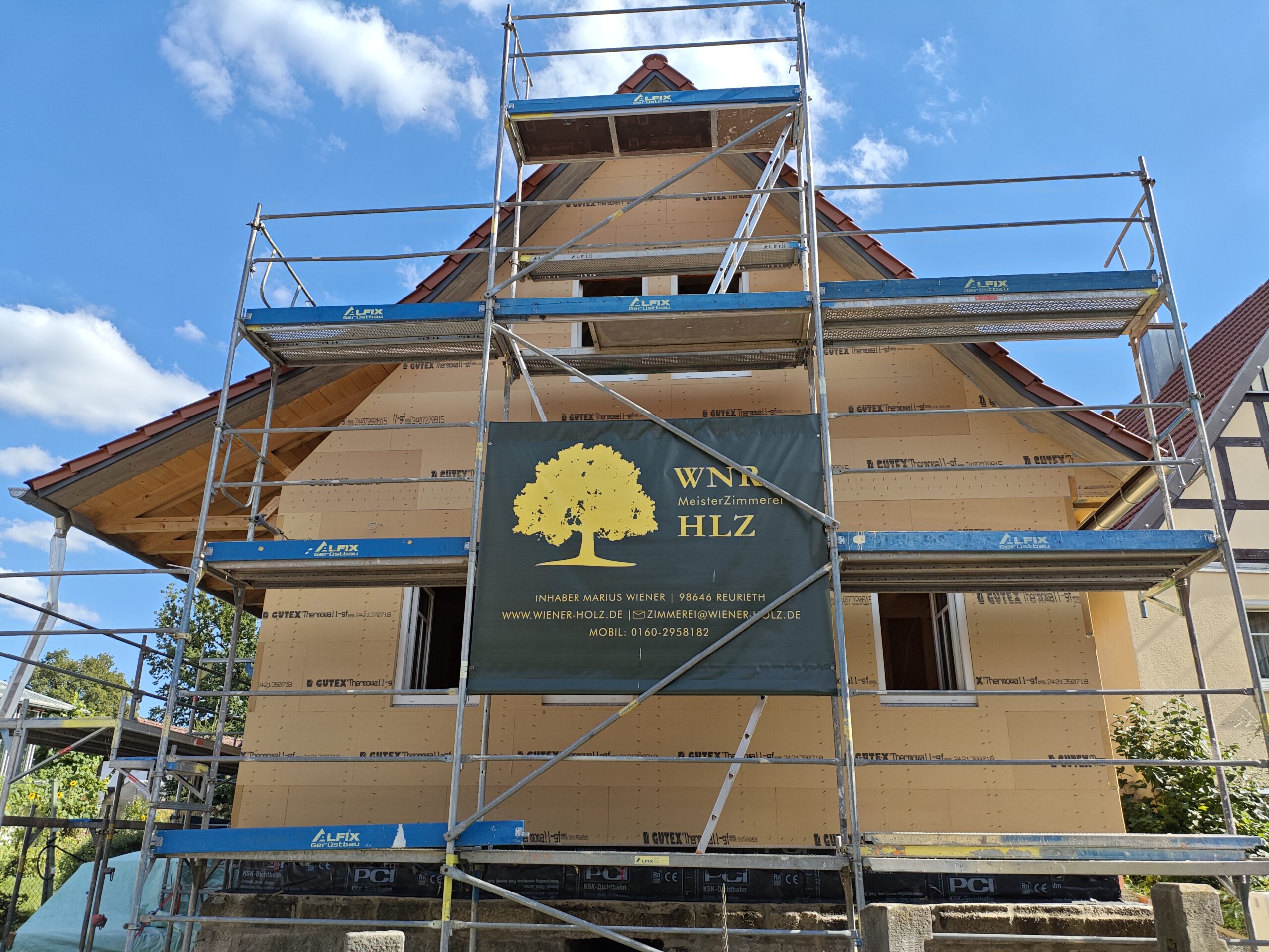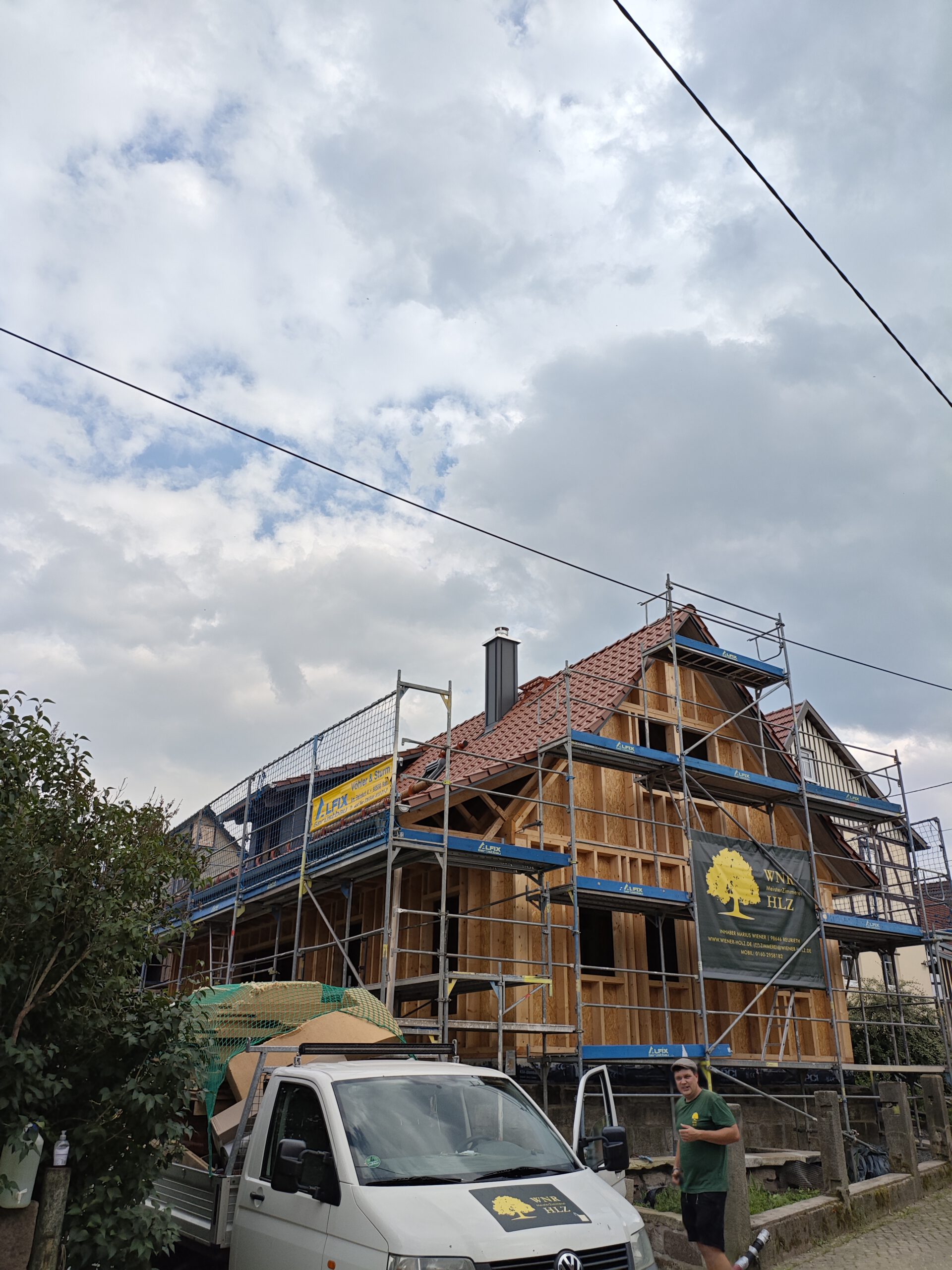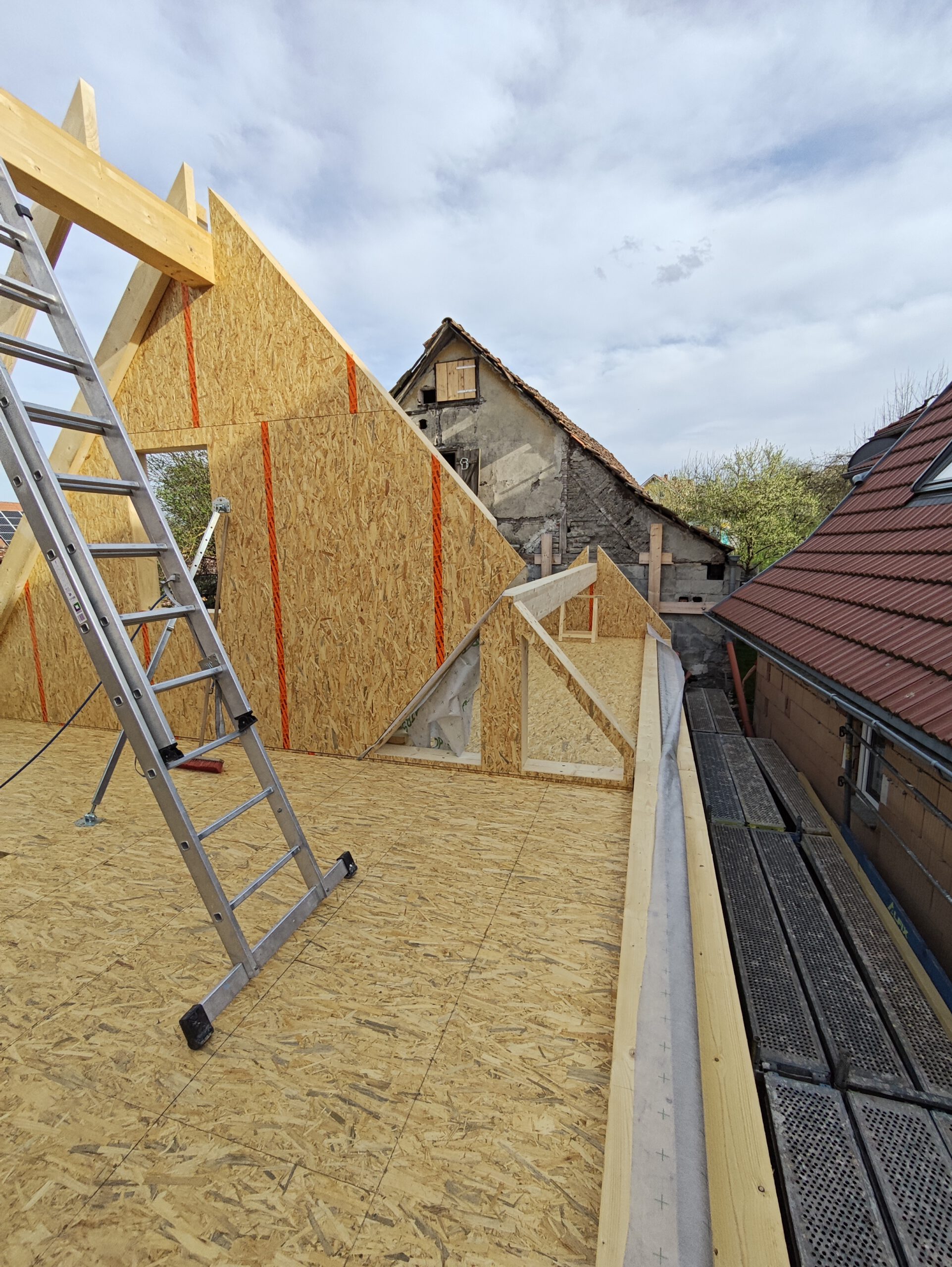 Anfang April 2025 begann die Montage des Holzhauses mit dem Setzen der Nivellierschwellen. In kurzer Bauzeit wurden die insgesamt 37 Wandelemente montiert sowie die Balken-, Pfetten- und Sparrenlagen aufgerichtet. Nach dem Richtfest folgten die Montage des freitragenden Vordachs und die vollständige Wetterfestmachung des Gebäudes. Diese umfasste die Beplankung mit diffusionsoffenen Holzweichfaserplatten, die Lattung, den Einbau der Dachfenster, sämtliche Klempnerarbeiten sowie die Ziegeleindeckung. Bereits Anfang Juni war der Rohbau des Einfamilienhauses abgeschlossen.