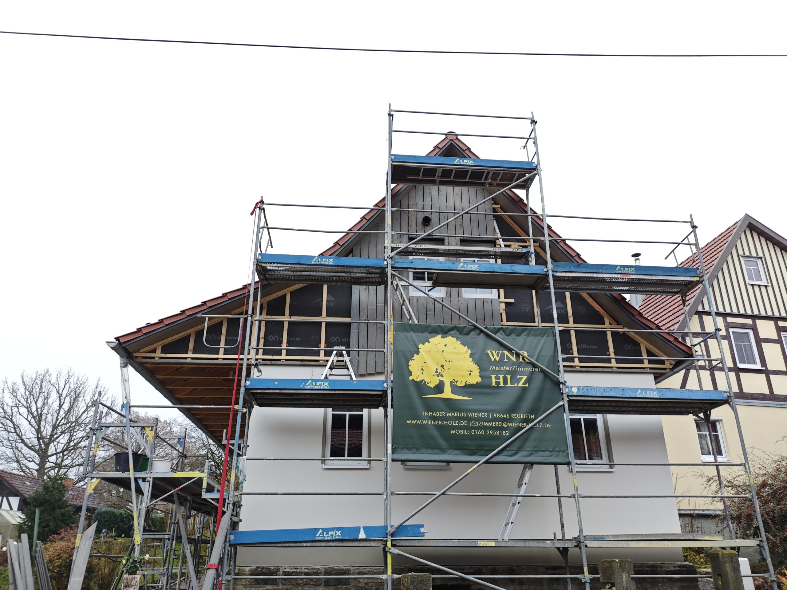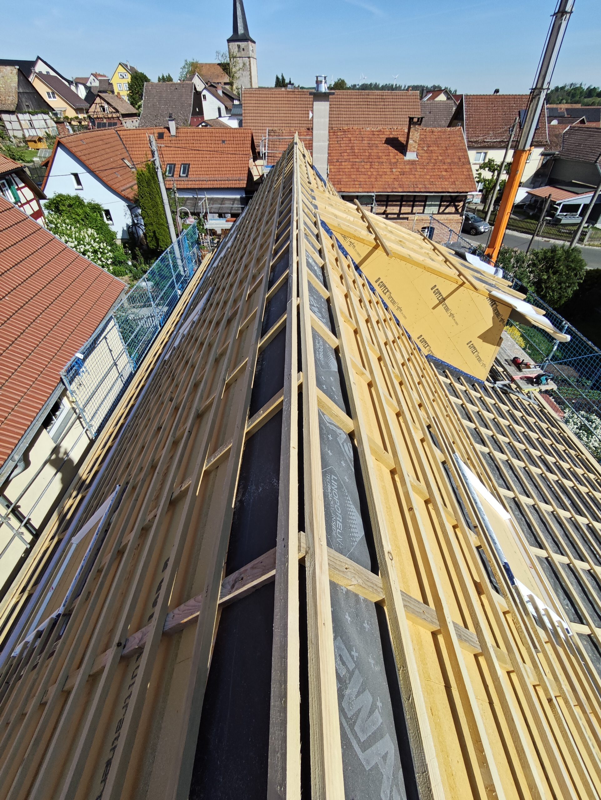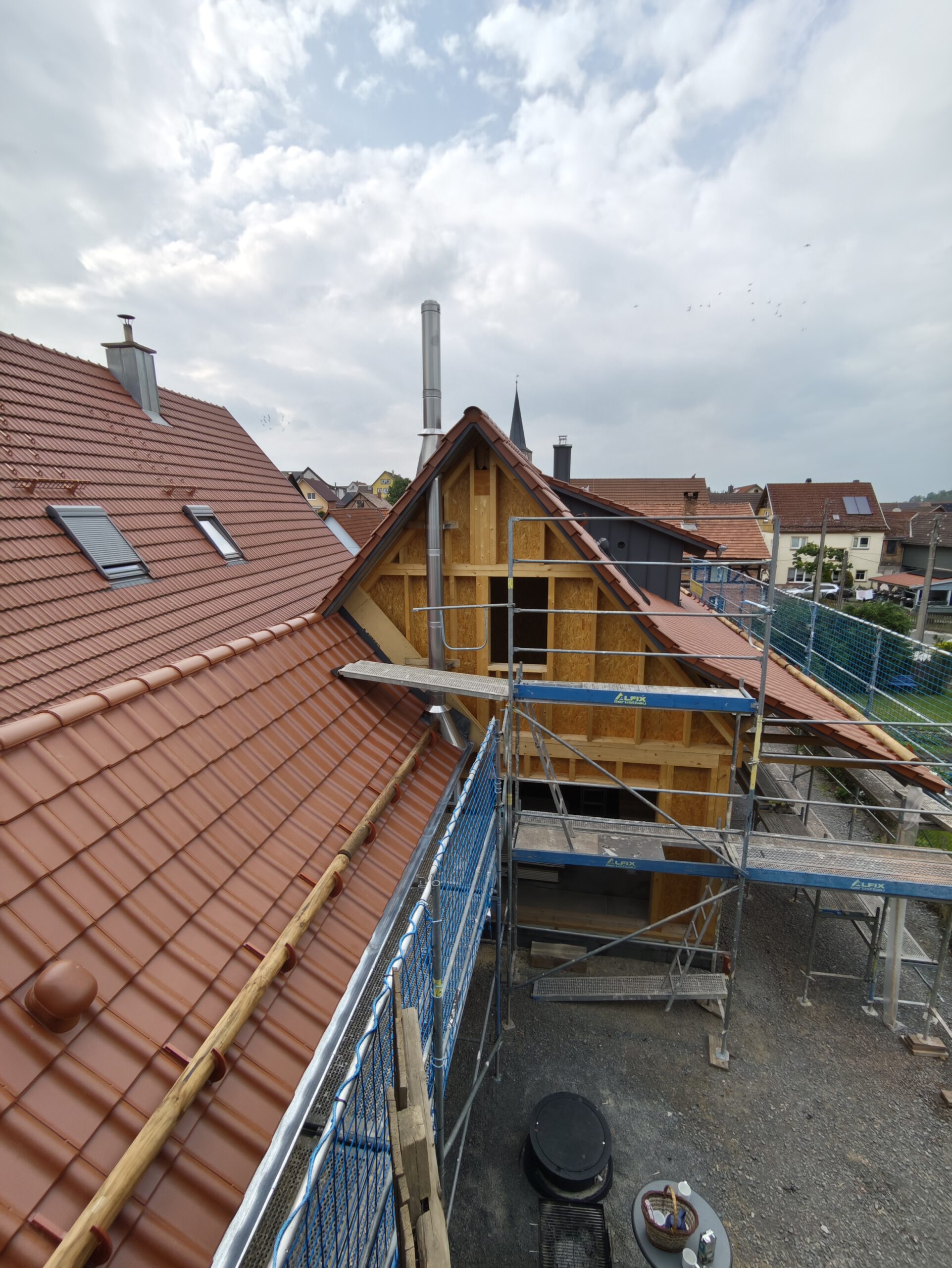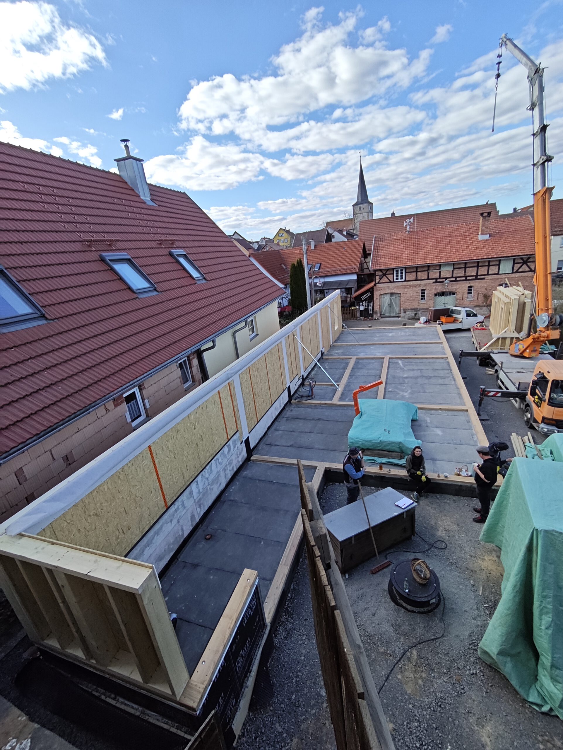Anfang April 2025 begann die Montage des Holzhauses mit dem Setzen der Nivellierschwellen. In kurzer Bauzeit wurden die insgesamt 37 Wandelemente montiert sowie die Balken-, Pfetten- und Sparrenlagen aufgerichtet. Nach dem Richtfest folgten die Montage des freitragenden Vordachs und die vollständige Wetterfestmachung des Gebäudes. Diese umfasste die Beplankung mit diffusionsoffenen Holzweichfaserplatten, die Lattung, den Einbau der Dachfenster, sämtliche Klempnerarbeiten sowie die Ziegeleindeckung. Bereits Anfang Juni war der Rohbau des Einfamilienhauses abgeschlossen.