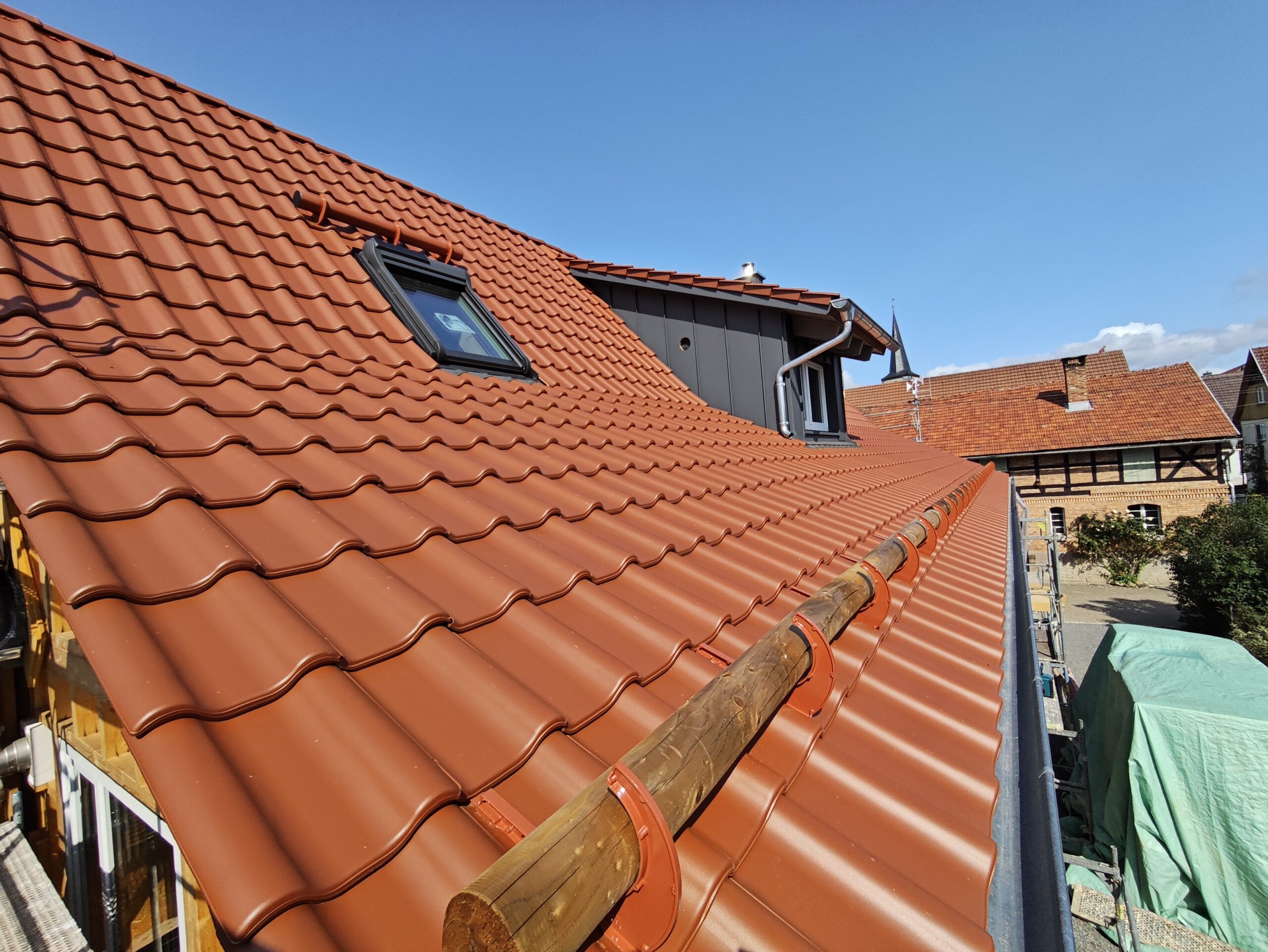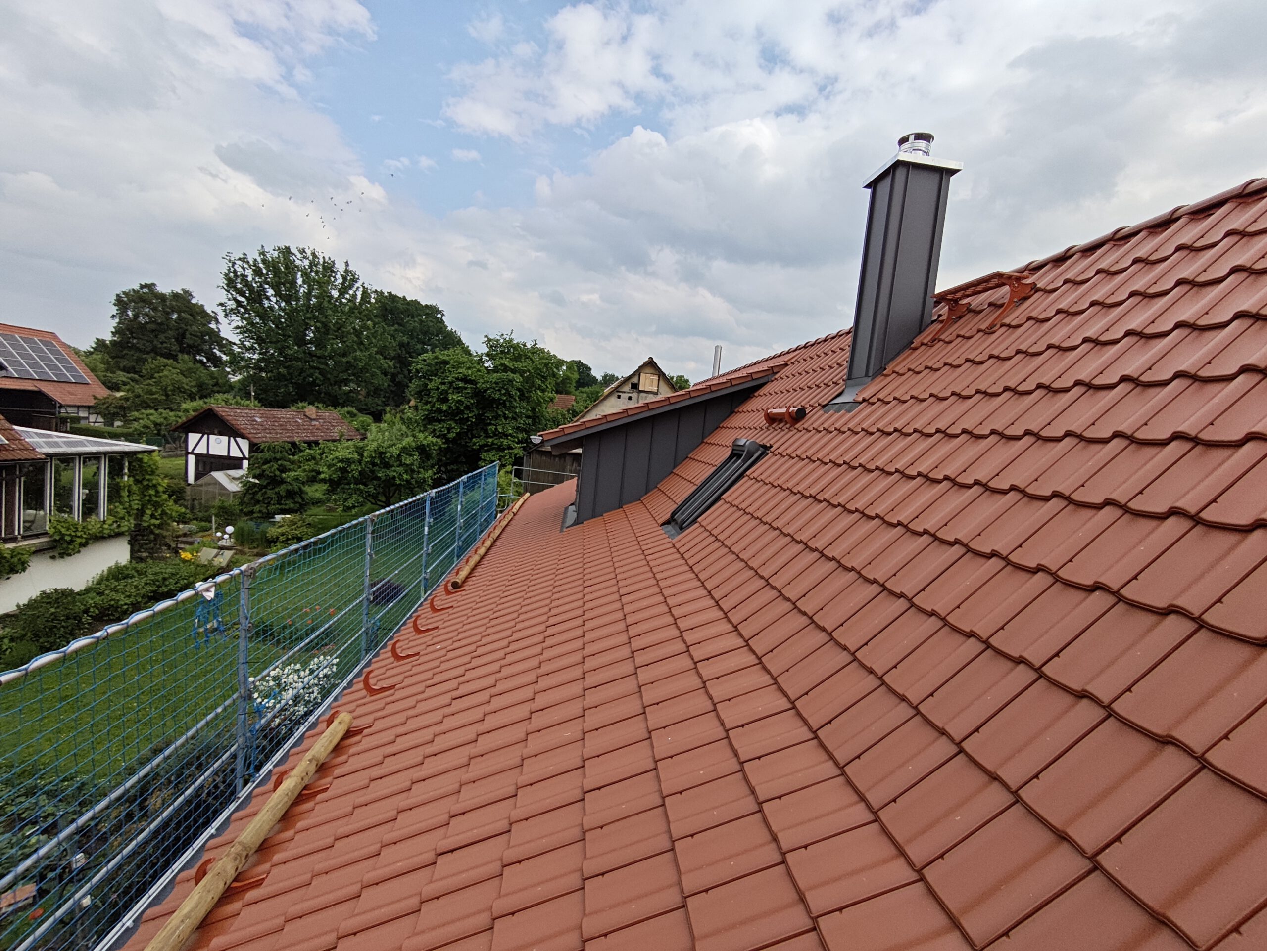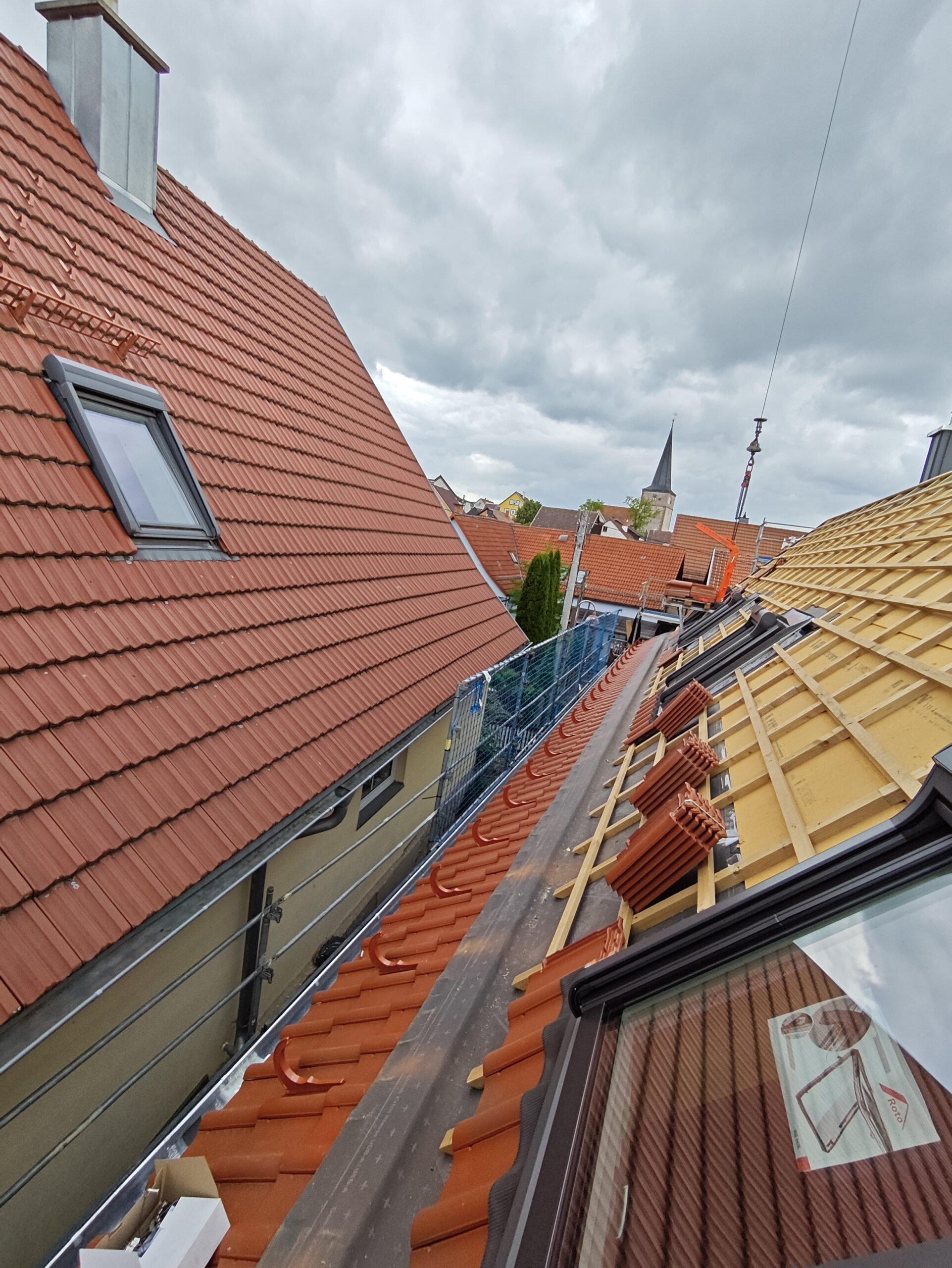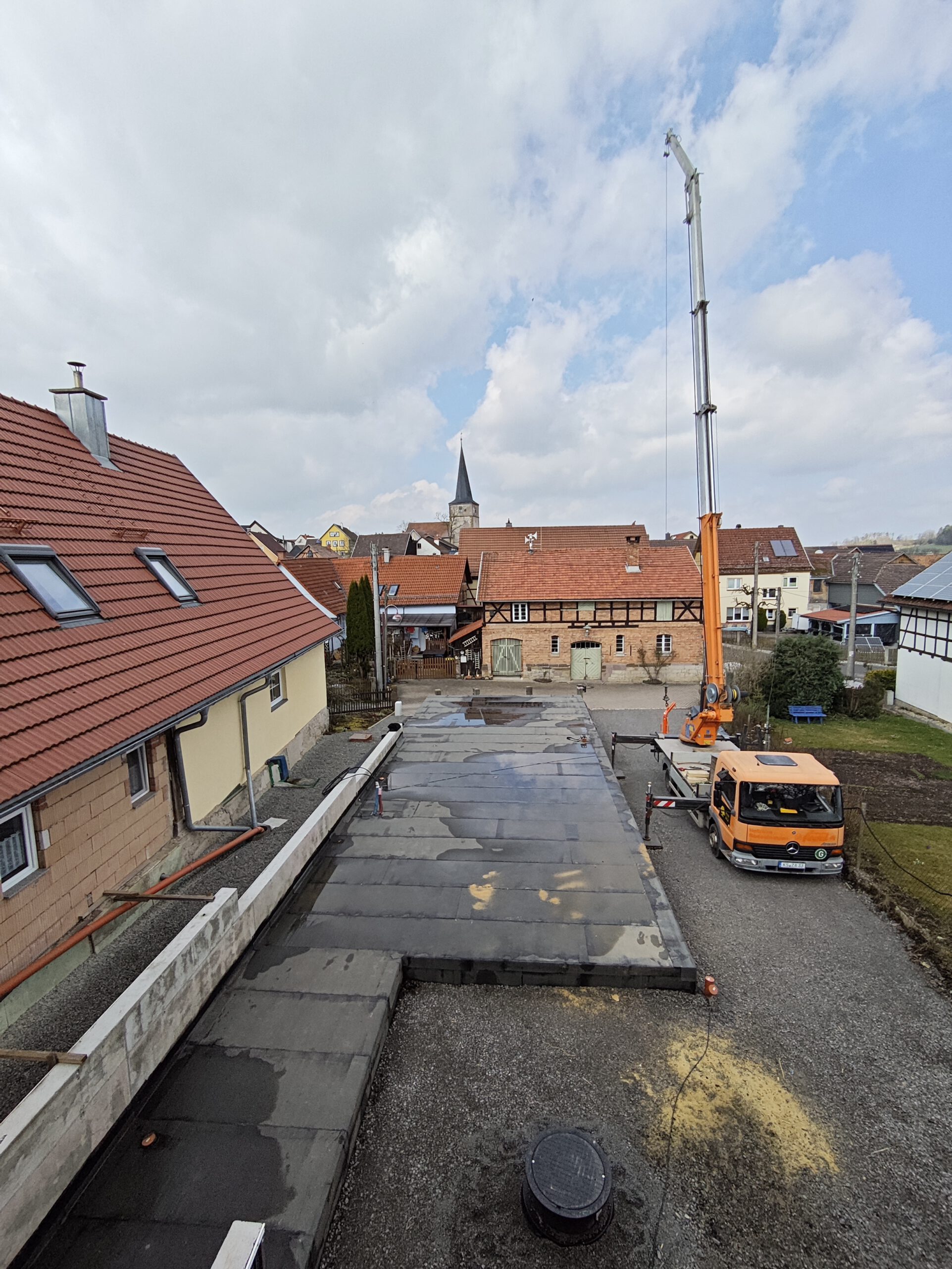 Anfang April 2025 begann die Montage des Holzhauses mit dem Setzen der Nivellierschwellen. In kurzer Bauzeit wurden die insgesamt 37 Wandelemente montiert sowie die Balken-, Pfetten- und Sparrenlagen aufgerichtet. Nach dem Richtfest folgten die Montage des freitragenden Vordachs und die vollständige Wetterfestmachung des Gebäudes. Diese umfasste die Beplankung mit diffusionsoffenen Holzweichfaserplatten, die Lattung, den Einbau der Dachfenster, sämtliche Klempnerarbeiten sowie die Ziegeleindeckung. Bereits Anfang Juni war der Rohbau des Einfamilienhauses abgeschlossen.