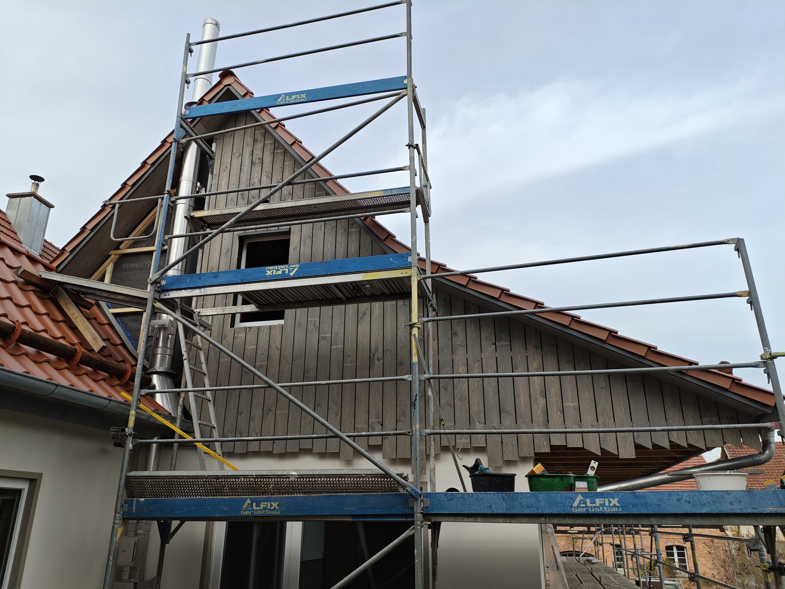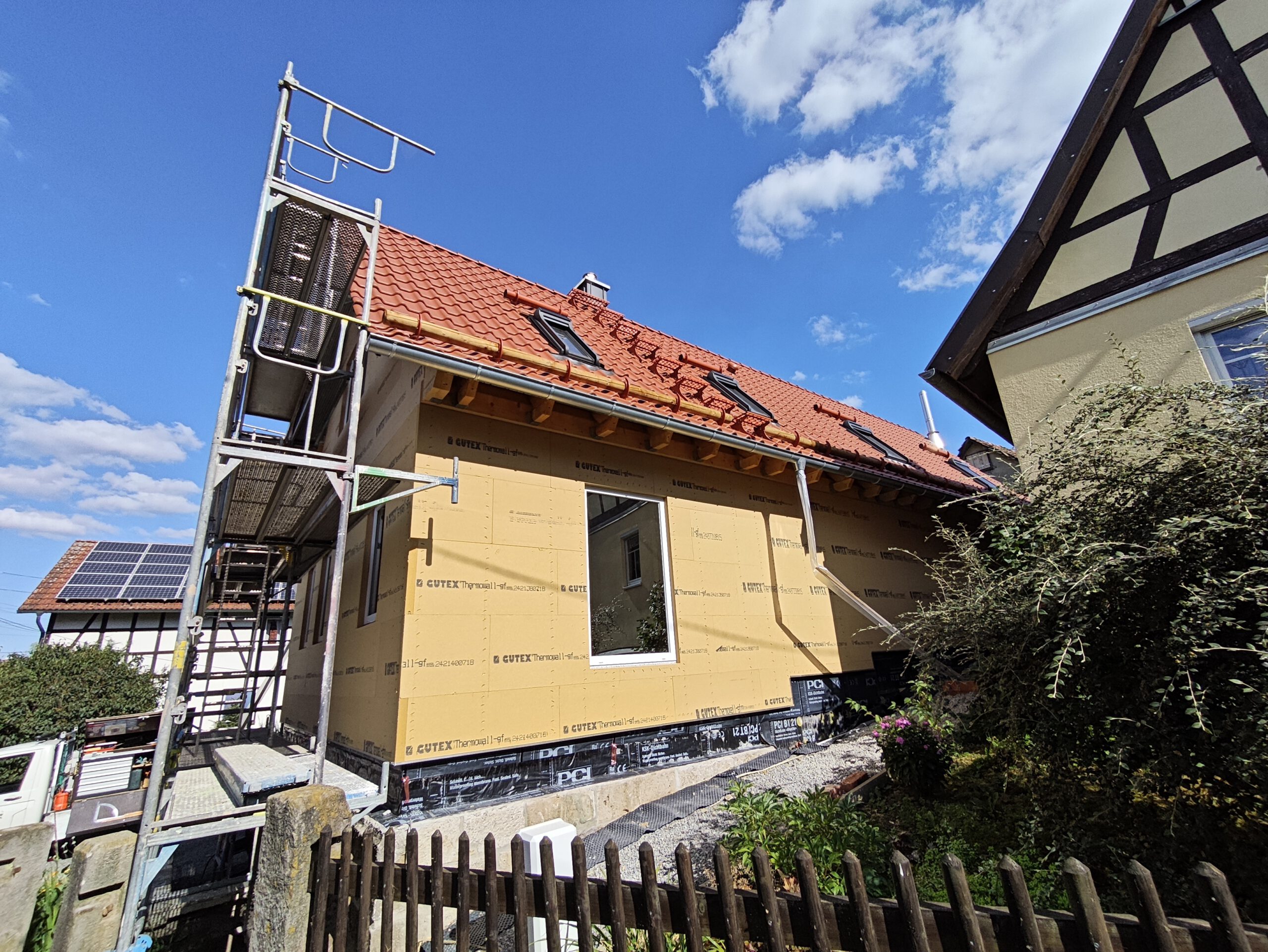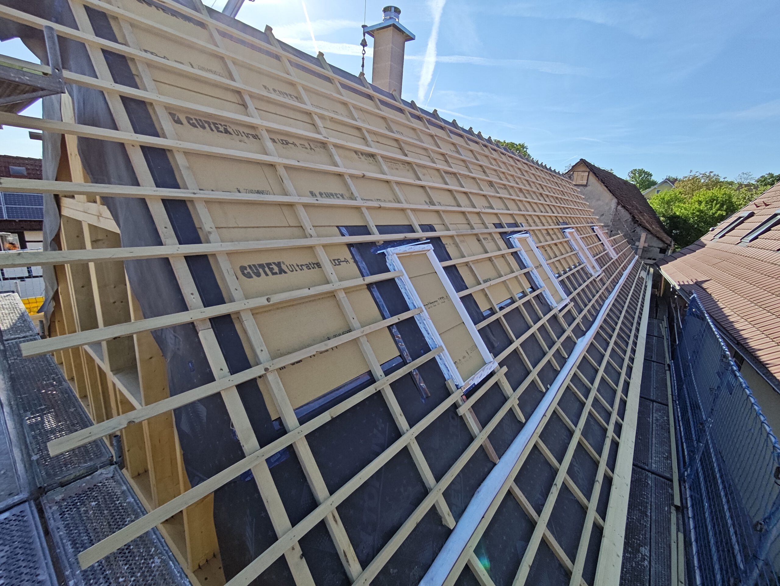 Im nächsten Bauabschnitt standen die Fassaden- und Dämmarbeiten im Fokus. Außen erhielt das Gebäude eine zusätzliche Dämmebene aus Holzweichfaserplatten, die sowohl den Wärme- als auch den sommerlichen Hitzeschutz verbessert. Innen wurden unter den Sparren eine Dampfbremse und eine Installationsebene mit Lattung eingebaut. Die komplette Gebäudehülle wurde anschließend mit hochwertiger Holzfaser-Einblasdämmung ausgeblasen – ein ökologisches Dämmverfahren, für das wir zertifiziert sind und das ein gesundes Wohnklima unterstützt.