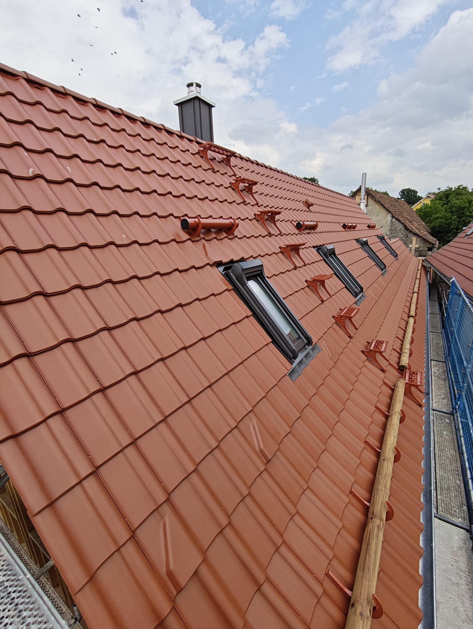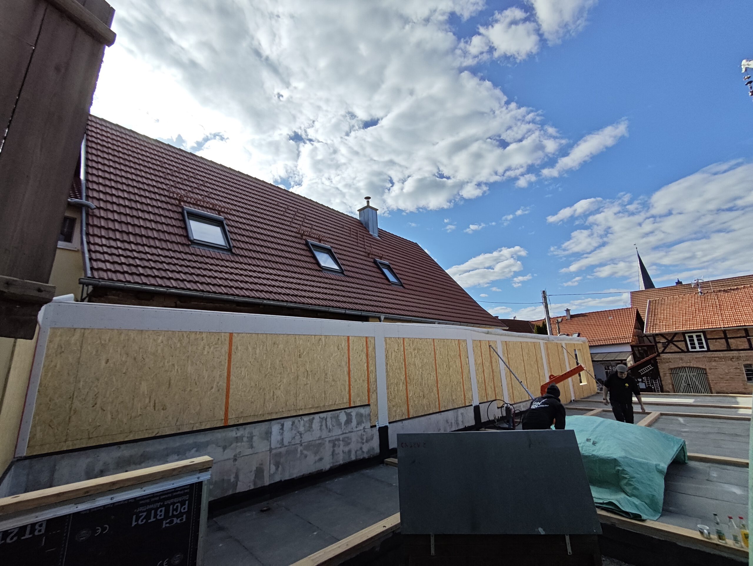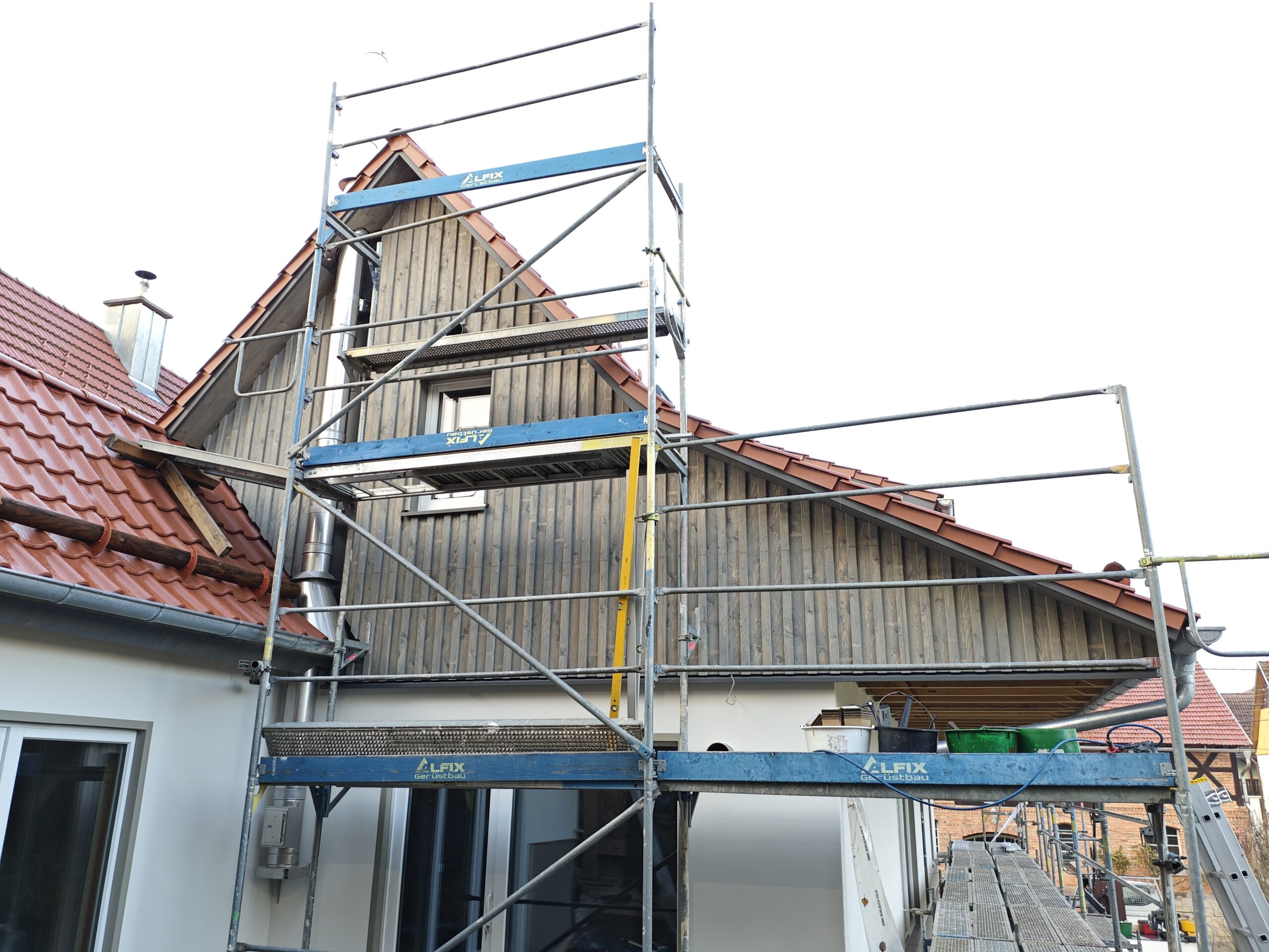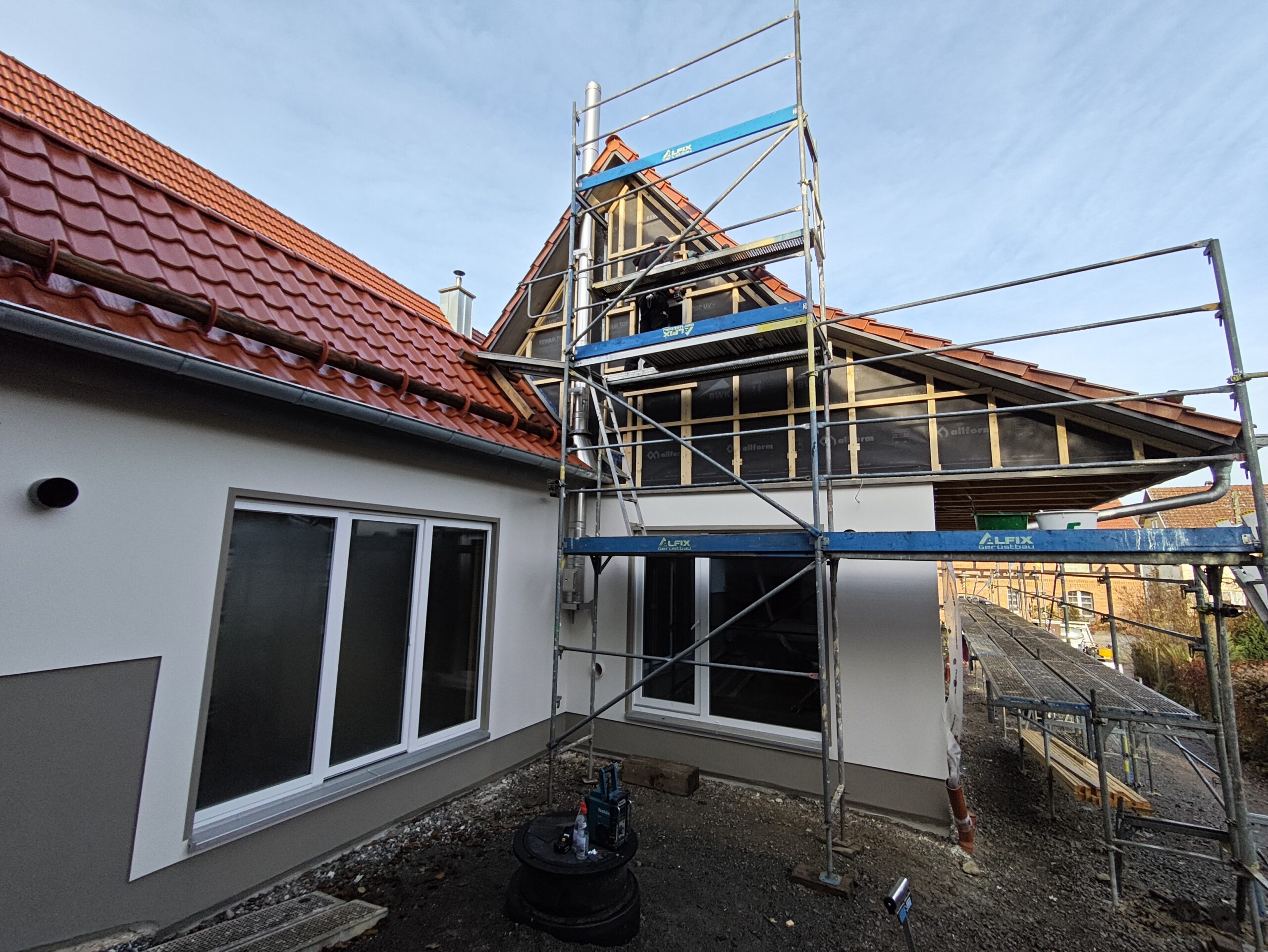 Im nächsten Bauabschnitt standen die Fassaden- und Dämmarbeiten im Fokus. Außen erhielt das Gebäude eine zusätzliche Dämmebene aus Holzweichfaserplatten, die sowohl den Wärme- als auch den sommerlichen Hitzeschutz verbessert. Innen wurden unter den Sparren eine Dampfbremse und eine Installationsebene mit Lattung eingebaut. Die komplette Gebäudehülle wurde anschließend mit hochwertiger Holzfaser-Einblasdämmung ausgeblasen – ein ökologisches Dämmverfahren, für das wir zertifiziert sind und das ein gesundes Wohnklima unterstützt.