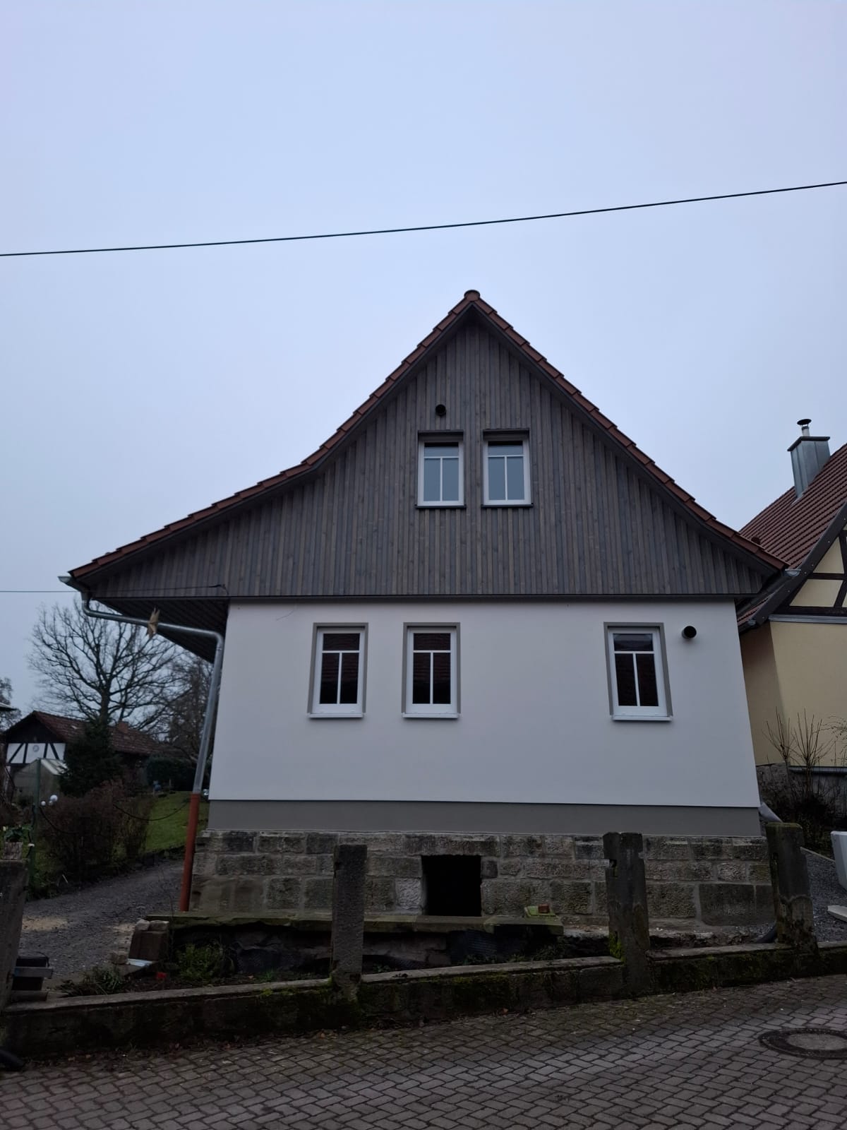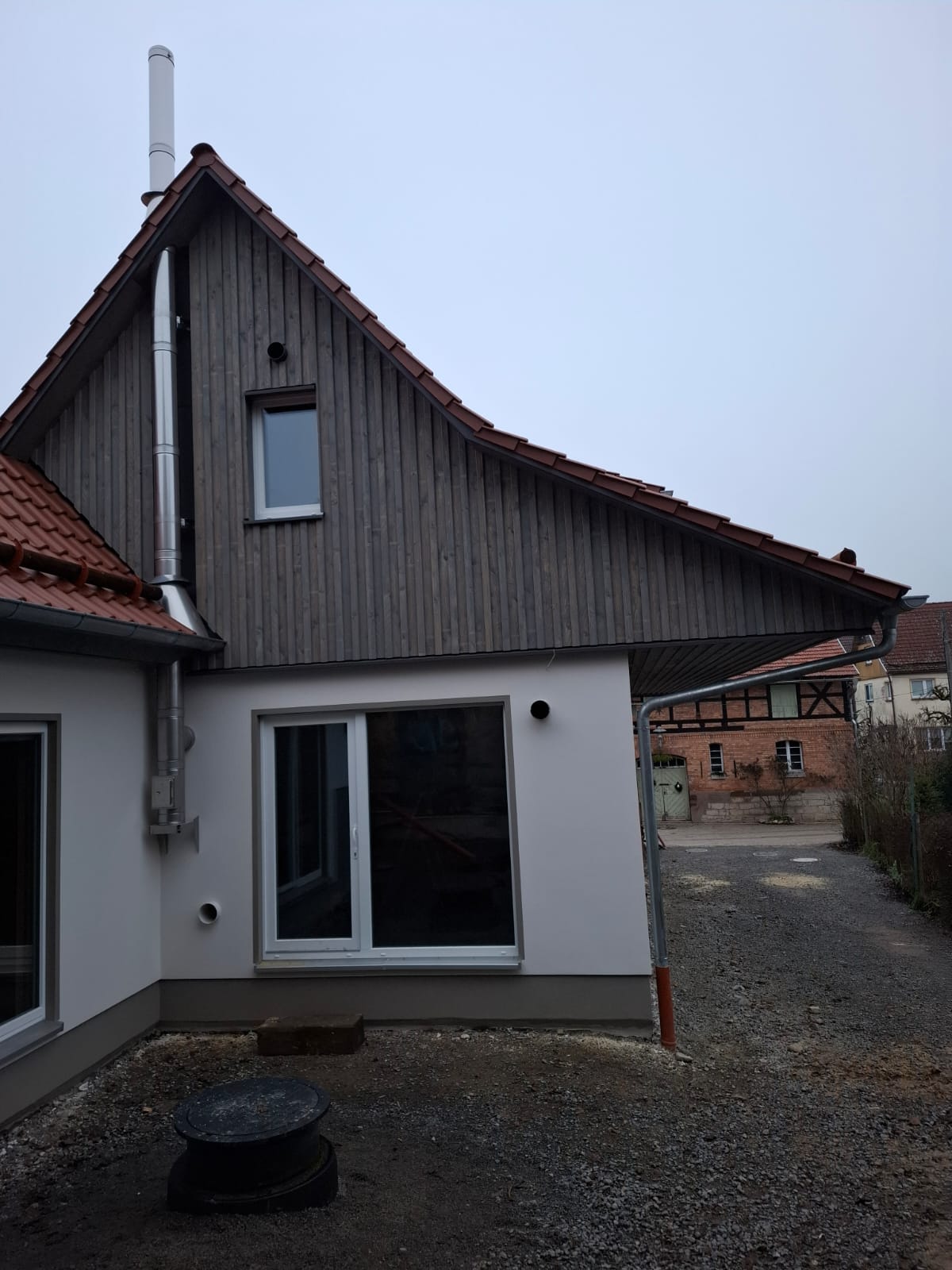 Nach Abschluss der Putzarbeiten folgte die finale Gestaltung der Außenfassade. Eine langlebige Holzfassade in Boden-Leisten-Schalung verleiht dem Haus seinen natürlichen Charakter und fügt sich harmonisch in die Umgebung ein. Die Fertigstellung des Holzhauses erfolgte planmäßig Ende November 2025.